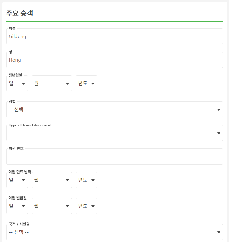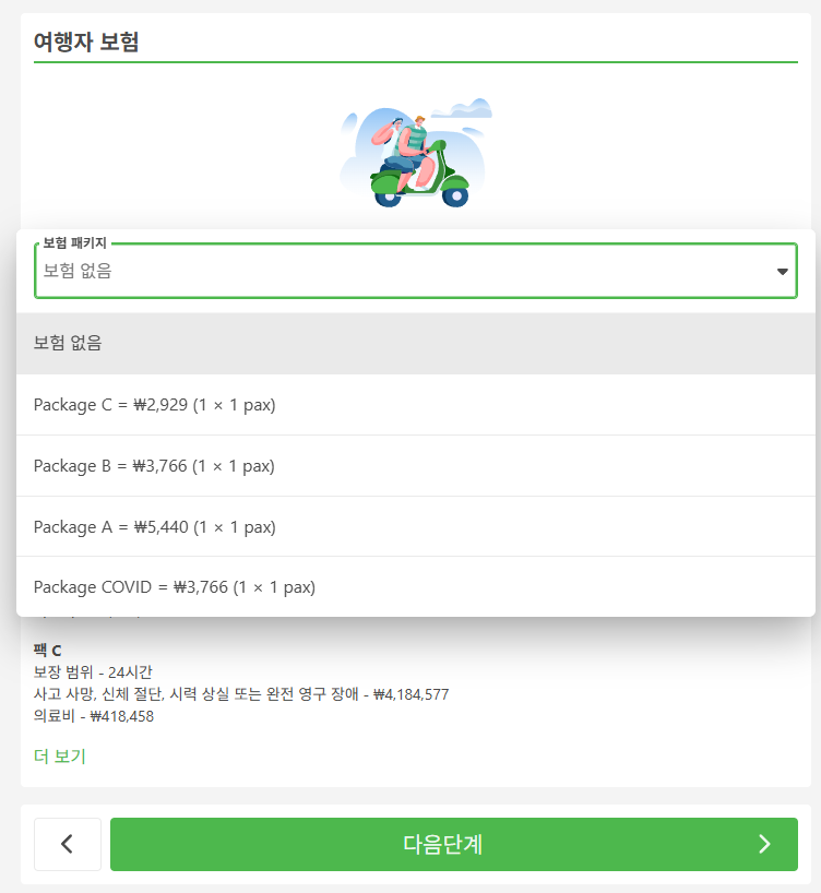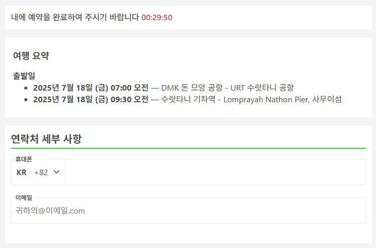 방콕에서 코사무이로 이동하는 교통편 항공 + 버스 + 페리 패키지(방콕공항 - 수랏타니공항 - 육로이동 - 항구 - 페리 이동 - 코사무이)를 예로 들면 예약시에는 휴대폰번호(현지번호 또는 한국번호 모두 가능), 이메일, 이름, 성, 생년월일, 성별, 신분증 선택(여권), 여권번호, 여권 만료 날짜, 여권 발급일, 국적을 입력하고 위탁수하물은 유료로 추가하실 수 있습니다. 그리고 여행자 보험은 선택사항입니다.