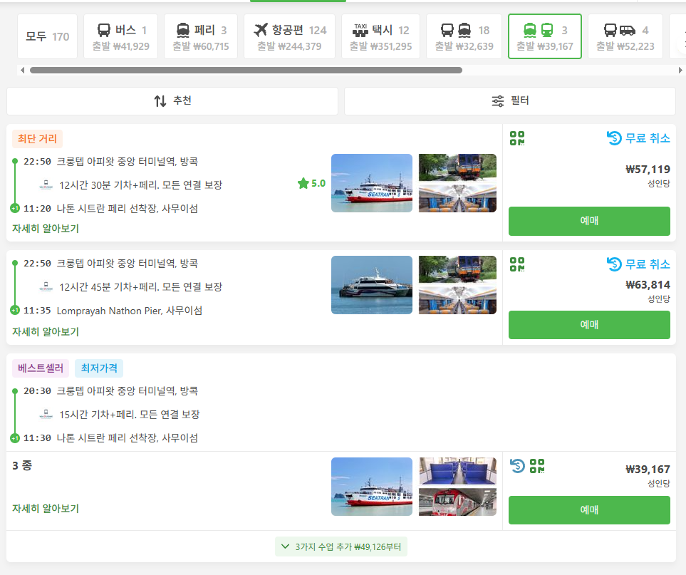 방콕에서 코사무이로 이동하는 버스, 페리 연계 교통편 및 항공 교통편 노선정보 및 예약은 12go사이트에서 예약하실 수 있으며, 이 노선 뿐만아니라 나라전역의 노선, 나라간 노선의 검색가능한 모든 교통편을 검색하고 예약하실 수 있습니다. 한국어로 검색해보시고 나오지 않으면 영어로 검색하시면 보다 쉽게 노선을 확인하실 수 있습니다. 모든 교통편은 예약을 빨리 하실 수록 저렴한 가격대의 좌석을 선택하실 수 있으며 하루, 이틀 전에 예약하시려고 하면 원하는 시간대가 없거나 만석으로 예약을 못하실 수 있습니다. 교통편은 미리미리 예약하시는 것을 추천합니다.