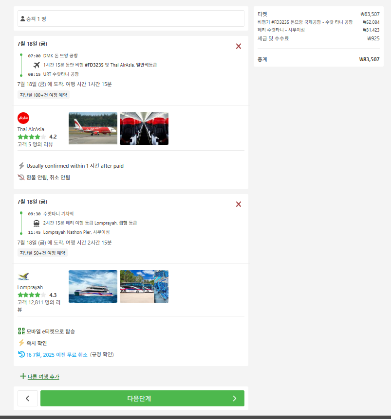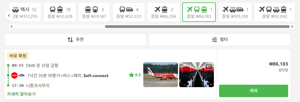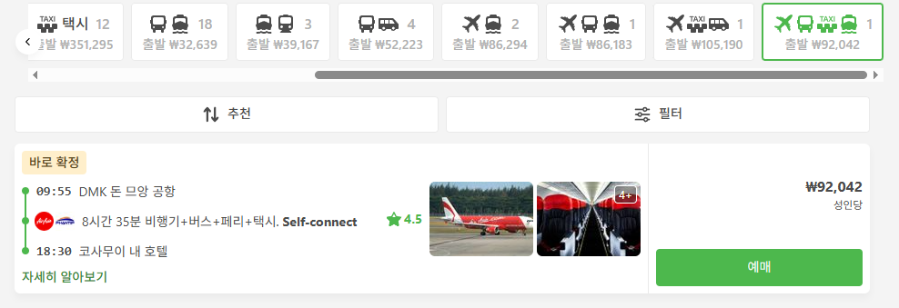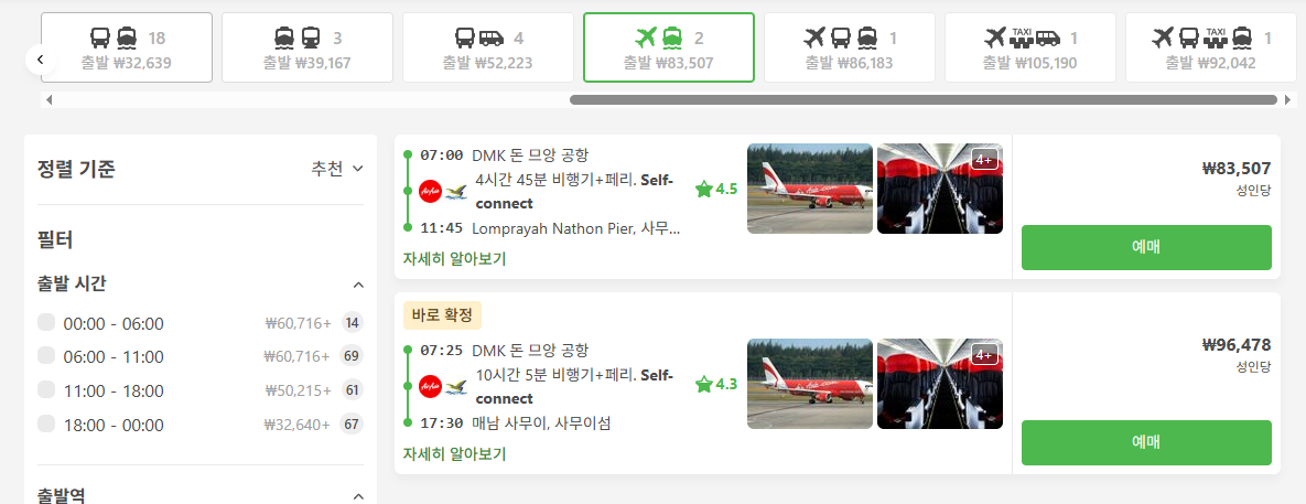 만약 항공권 비용을 좀 더 절약하고 싶으시다면, 방콕 돈므앙 공항에서 수랏타니 공항 으로 가는 저가 항공편을 이용하는 방법도 있습니다. 비행시간은 약 1시간 15분 정도로 비슷하지만, 항공권 가격은 훨씬 저렴할 수 있어요. 이들 공항에 도착한 후에는 공항에서 코사무이로 가는 버스와 페리 연계 서비스를 이용하게 됩니다. 직항보다는 시간이 조금 더 걸리겠지만, 예산을 아끼면서도 비교적 빠르게 이동할 수 있는 좋은 대안이 될 수 있습니다.