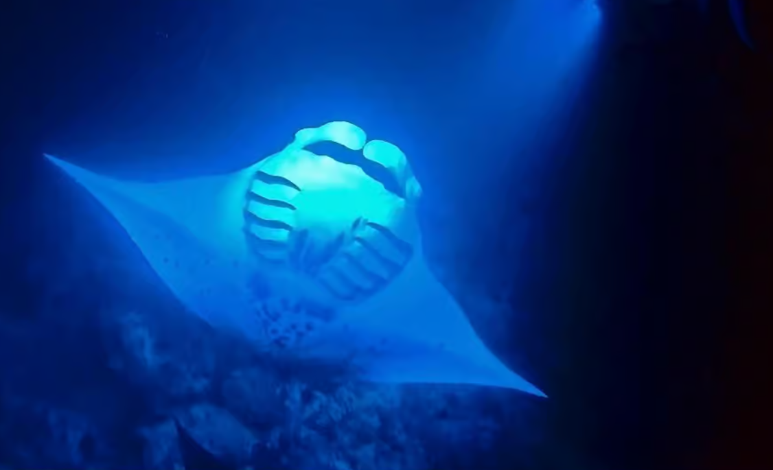 여기에 더해, 인간의 활동이 만타가오리들을 더욱 잘 관찰할 수 있게 만들었습니다. 특히 코나 해안가의 호텔이나 투어 보트에서 밤에 바닷속으로 조명을 비추는 경우가 많은데요, 이 밝은 빛은 작은 플랑크톤들을 끌어모읍니다. 플랑크톤은 만타가오리의 주식이기 때문에, 빛이 모이는 곳으로 만타가오리들이 자연스럽게 모여들어 먹이 활동을 하게 됩니다. 이렇게 특정 장소에 만타가오리들이 예측 가능하게 나타나면서, 방문객들이 이들을 가까이에서 관찰할 수 있는 기회가 많아지게 된 것이죠.