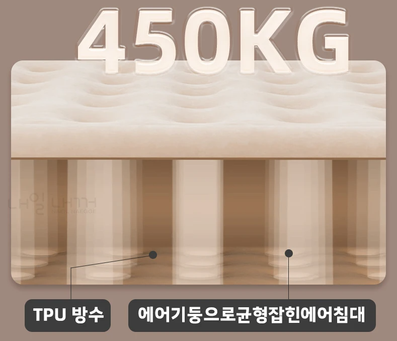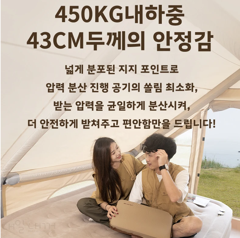 또한, NAEIL NAEGGE 에어매트는 최대 450kg에 달하는 놀라운 하중을 견딜 수 있도록 설계되었습니다. 이는 매트 위에 여러 사람이 함께 앉거나 누워도, 혹은 무거운 짐을 올려두어도 전혀 문제없이 안정적으로 사용할 수 있다는 의미입니다. 특히 가족이나 친구들과 함께하는 캠핑에서 매트의 견고함은 매우 중요한 요소로 작용합니다. 밤새 뒤척이거나 움직여도 매트가 흔들리거나 꺼질 걱정 없이, 마치 집 침대처럼 편안하고 안정적인 지지력을 느낄 수 있어 숙면을 취하는 데 큰 도움이 됩니다.