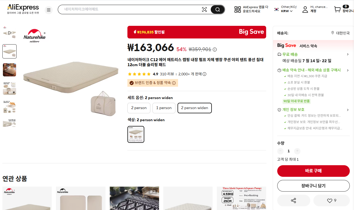 NAEIL NAEGGE 자충 자동충전 캠핑매트는 알리익스프레스 직구사이트에서 저렴하게 구매하실 수 있습니다. 알리익스프레스 중국 대형 전자상거래 플랫폼 1위 알리바바 그룹이 운영하는 온라인 쇼핑몰로 저렴한 가격으로 다양한 상품을 구매할 수 있다는 점입니다. 폭넓은 카테고리에서 전자제품, 의류, 액세서리 등을 제공하며, 전 세계로 배송이 가능하고 무료 배송 옵션도 있습니다. 안전한 결제를 위한 에스크로 시스템이 마련되어 있어 거래가 안전합니다. 또한, 다른 소비자들의 리뷰와 평가를 통해 품질을 확인할 수 있으며, 모바일 앱을 통해 편리하게 쇼핑할 수 있습니다. 한국에서는 중국도매사이트로 유명하며 많은 제품들을 구매하여 한국내에서 소매로 판매하고 있습니다.