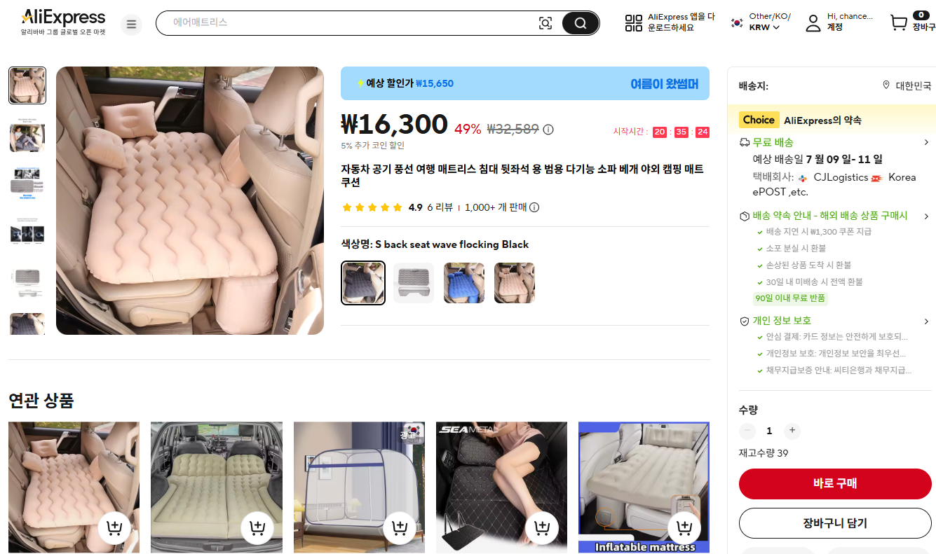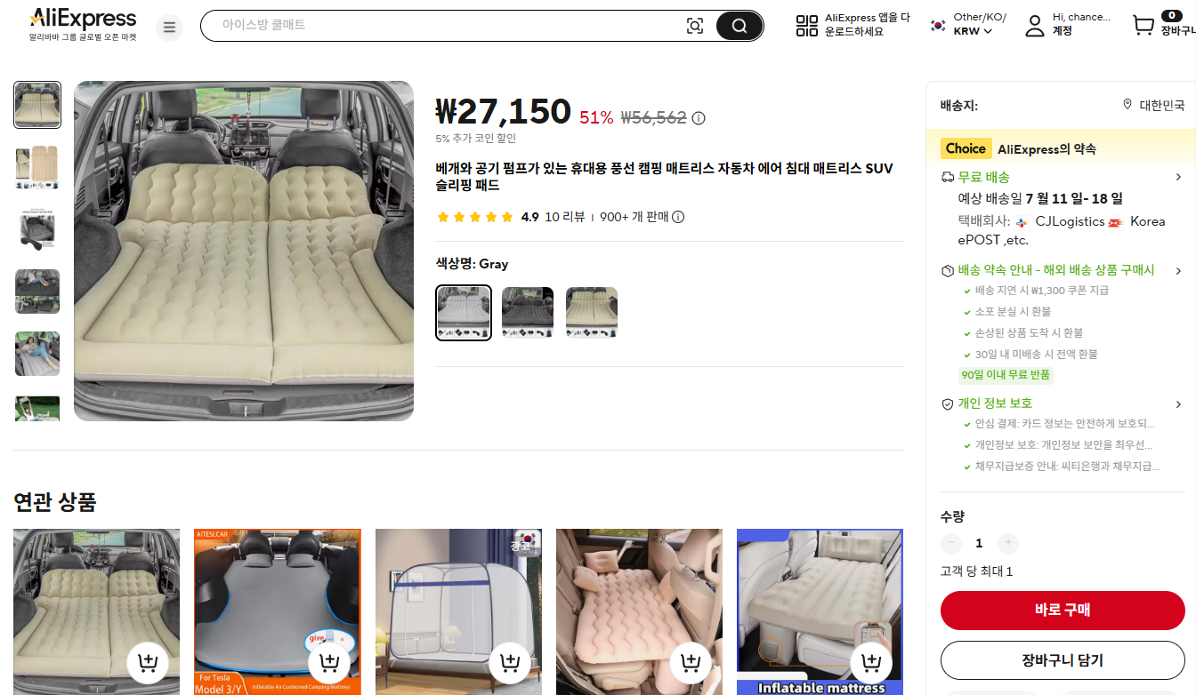 최저가 알리직구 캠핑매트추천 / 캠핑여행에 유용한 450kg 하중, 자동 충전기능을 갖춘 편리성의 에어매트