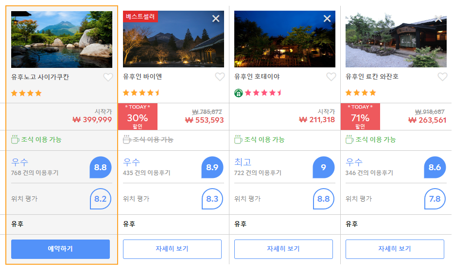 유후인료칸 유후노고 사이가쿠칸 (Yufunogo Saigakukan)의 최저 가격대는 아고다웹사이트에서 할인특가 가격으로 매일매일 변동되며 10만원대부터 다양하게 형성됩니다. 날짜별로 매일 가격이 다르므로 아고다웹사이트 최저가를 확인하시려면 아래 링크를 누르시고 원하는 날짜의 가격대를 선택해야 정확한 가격을 자세히 보실 수 있습니다.