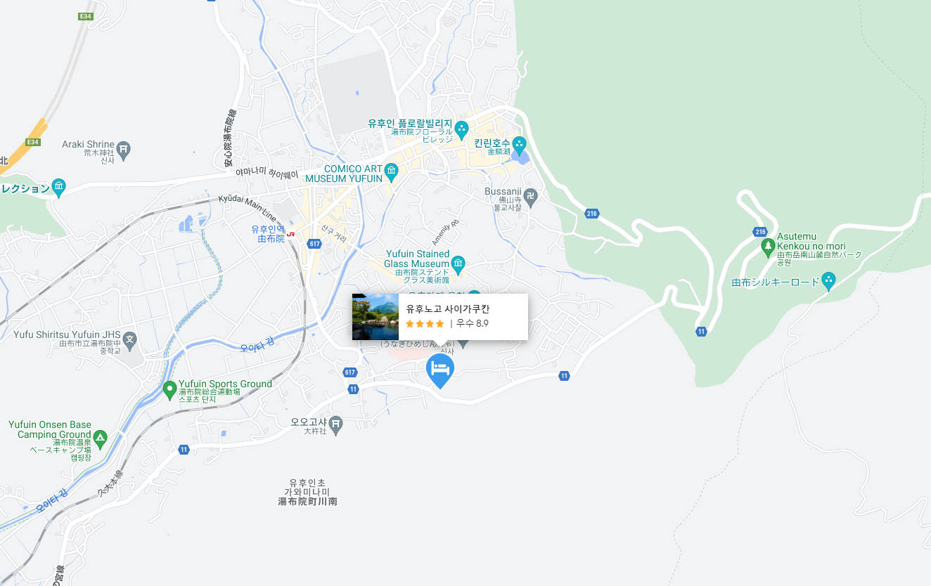 유후인료칸 유후노고 사이가쿠칸 (Yufunogo Saigakukan)은 유후인역에서 1.2km 거리에 있으며 료칸은 유후인 역에서 픽업 서비스를 제공합니다. 역에서 전화를 걸면 10분 만에 기사님이 데리러 오셨습니다. 직원들은 기본적인 영어를 구사할 수 있으며 그들과 의사 소통하는 데 확실히 충분합니다.