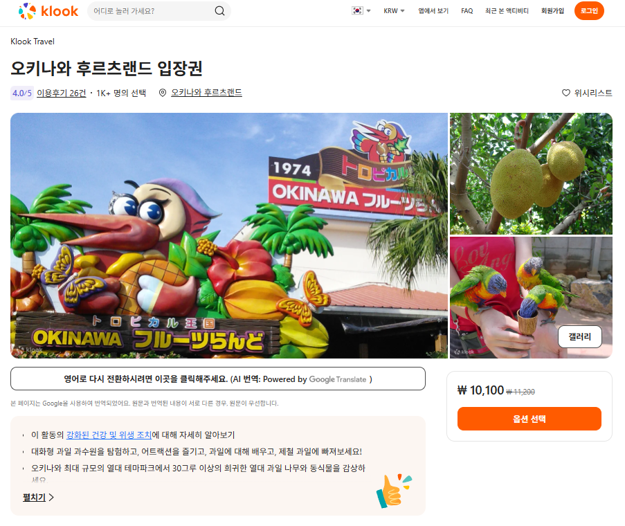 오키나와 후르츠 랜드 입장권은 클룩사이트에서 쉽게 예약하실 수 있으며, 이메일, 전화번호, 카카오톡, 네이버, 구글, 애플, 페이스복 등으로 간편하게 회원가입하고 이용하실 수 있습니다. 요금 및 일정, 포함사항은 변동될 수 있으므로 예약시 다시 확인하고 이용하세요~