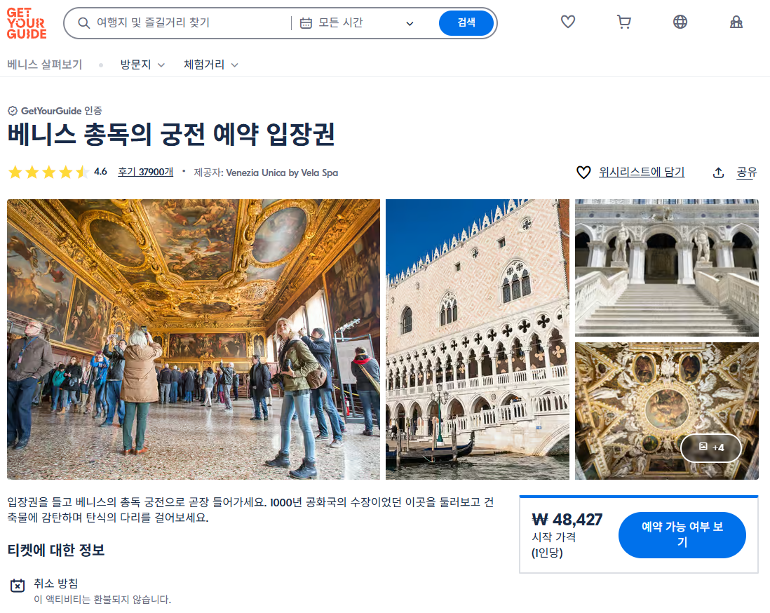 베니스 총독의 궁전 예약 입장권은 GET YOUR GUIDE 사이트에서 예약하실 수 있습니다. 사이트는 특히 전세계 대부분의 나라, 지역의 투어, 교통편 있어, 쉽게 찾을 수 없는 여행지의 다양한 투어 및 서비스를 이용할 수 있는 글로벌 사이트입니다. 전세계 여행자들이 많이 사용하는 사이트로 한국분들이 많이 예약하는 투어를 찾으신다면 klook 여행사이트 추천합니다. 함께 사용하시면 더욱 편하게 여행하실 수 있습니다.