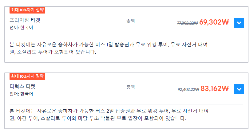 클래식, 프리미엄, 디럭스 티켓 중 하나를 골라