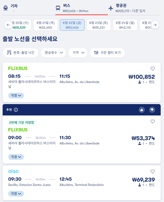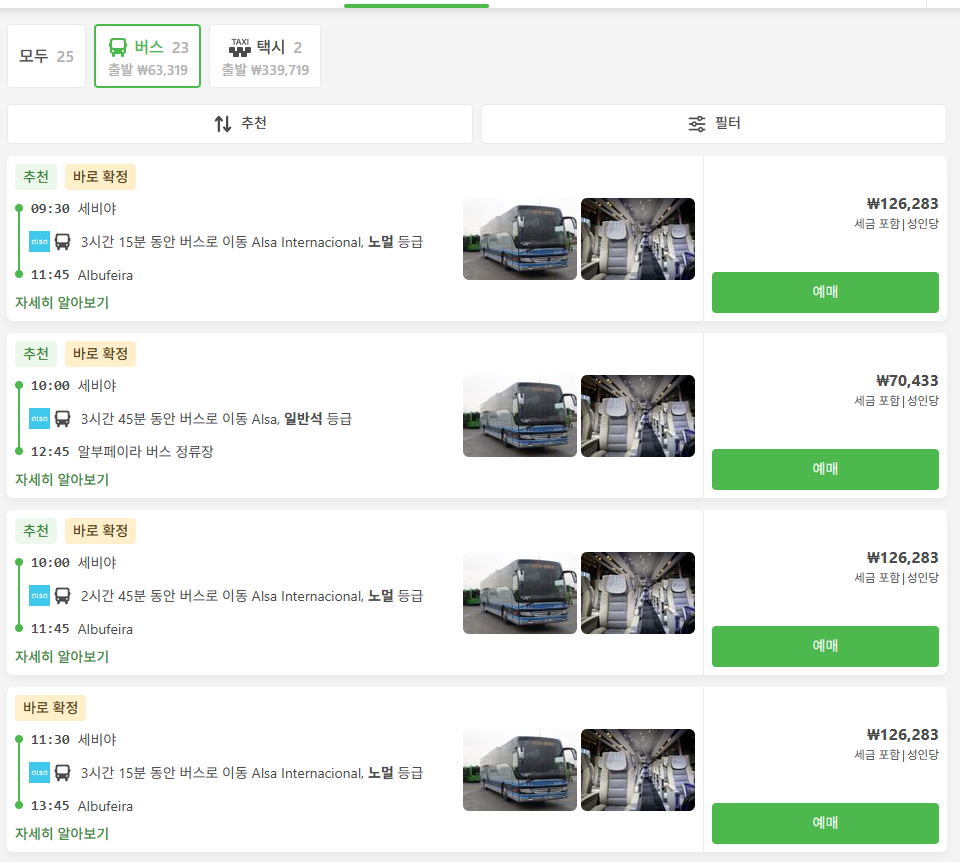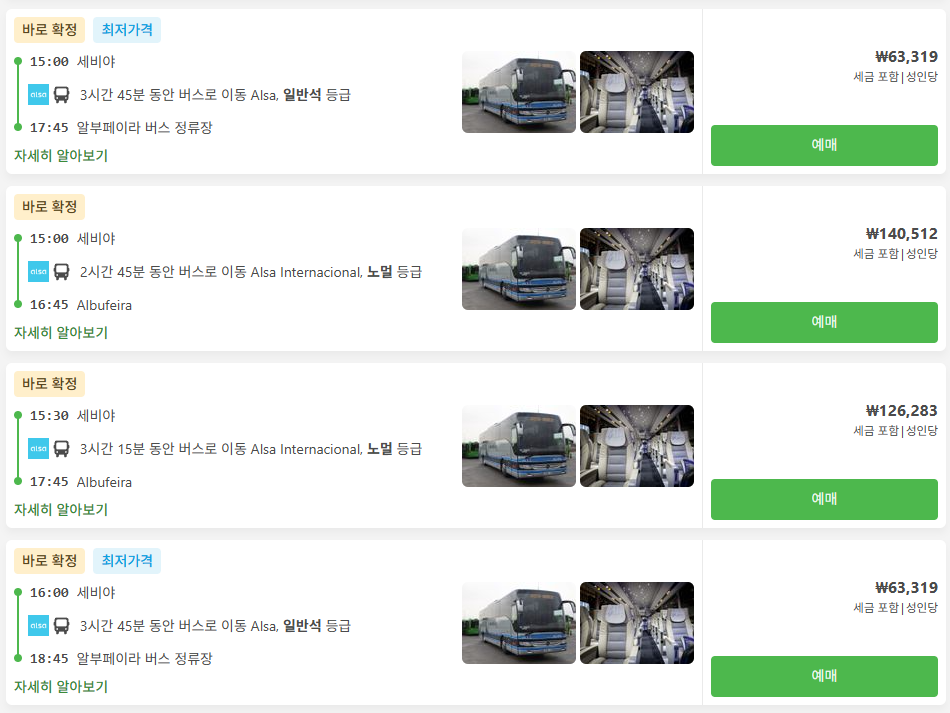 세비야에서 알부페이라로 가는 버스는 오전 9시대부터 23시 59분까지 다양한 시간대의 노선이 있으며 버스회사는 FlixBus, Alsa, Union Ivkoni International 등이 있습니다. 시간대 및 버스회사에 따라 요금과 소요시간이 조금씩 다르며 버스회사마다 타고 내리는곳이 차이가 있을 수 있습니다.
