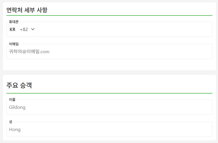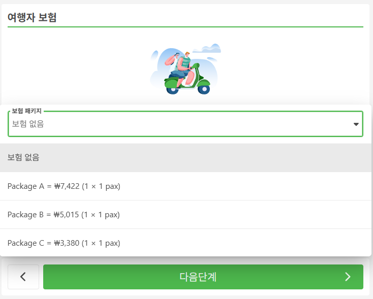 교통편 예약시에는 휴대폰번호(현지번호 또는 한국번호 모두 가능), 이메일, 이름, 성을 입력하고 여행자 보험은 선택사항입니다.
