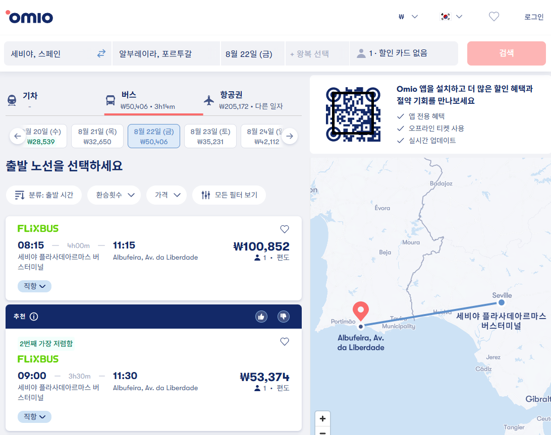 유럽자유여행에 스페인 세비야에서 가까운 포르투갈 인기휴양지 알부페이라로 이동하는 방법은 버스 및 택시로 이동이 가능하며 택시의 경우 2시간 30분정도 걸리지만 30만원대 높은 금액으로 추천드리지는 않고 플릭스 버스나 알사 버스를 타시면최저 6만원대에 3~4시간정도면 이동하실 수 있습니다.