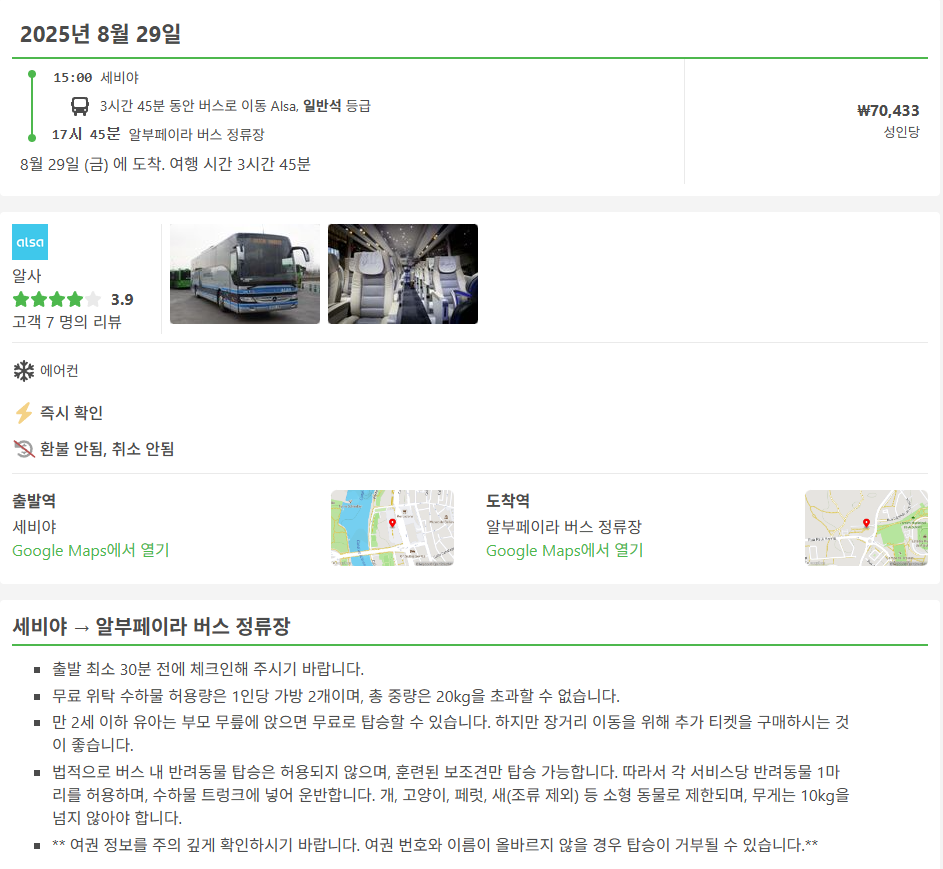 세비야에서 알부페이라로 이동하는 버스 교통편 노선정보 및 예약은 교통편 노선정보 및 예약은 12go사이트에서 예약하실 수 있으며, 이 노선 뿐만아니라 나라전역의 노선, 나라간 노선의 검색가능한 모든 교통편을 검색하고 예약하실 수 있습니다. 한국어로 검색해보시고 나오지 않으면 영어로 검색하시면 보다 쉽게 노선을 확인하실 수 있습니다. 모든 교통편은 예약을 빨리 하실 수록 저렴한 가격대의 좌석을 선택하실 수 있으며 하루, 이틀 전에 예약하시려고 하면 원하는 시간대가 없거나 만석으로 예약을 못하실 수 있습니다. 교통편은 미리미리 예약하시는 것을 추천합니다.