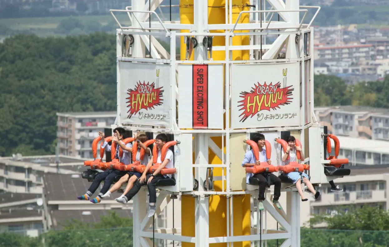 - 빨간색 타워인 크레이지 스툰은 천천히 올라간 후 일본 최초로 마이너스 2G의 중력으로 급강하하는데요, 내려올 때 강력한 무중력과 스릴을 경험하면서 마음껏 비명을 지를 수 있는 것이 특징이에요. 스트레스 해소에 최고일 거예요!