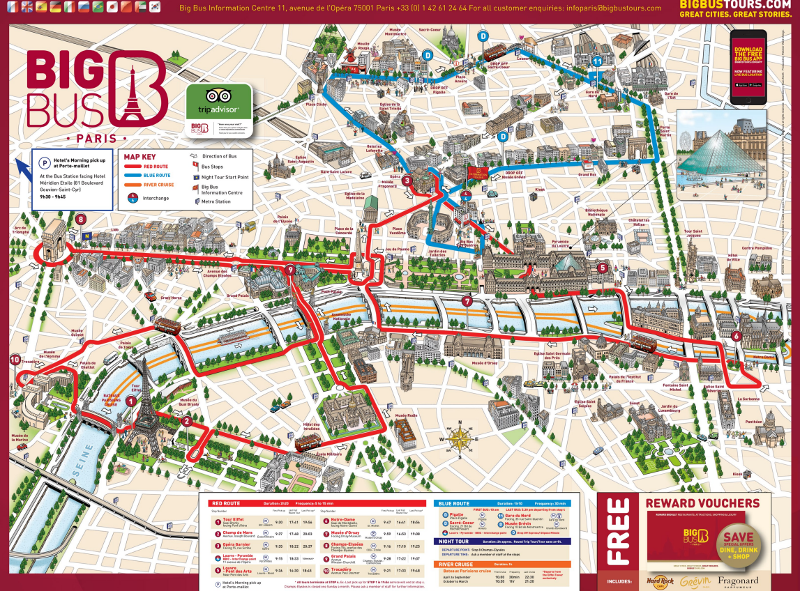 시티투어버스 빅버스 노선은 클래식노선(빨간색노선), 몽마르뜨노선(파란색노선)이 있으며,