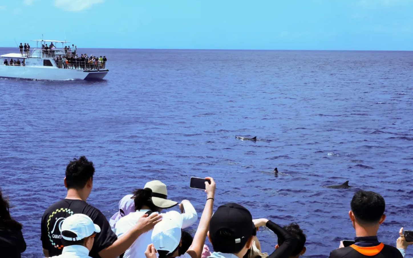 주변 바다는 따뜻한 수온 덕분에 야생 돌고래들에게는 최적의 서식지라고 해요. 그래서 돌핀 크루즈에 참여하시면 90% 이상의 아주 높은 확률로 야생 돌고래들을 직접 만날 수 있답니다. 배가 바다를 가로지르면, 어느 순간부터 돌고래들이 크루즈 주변으로 모여들기 시작할 거예요.