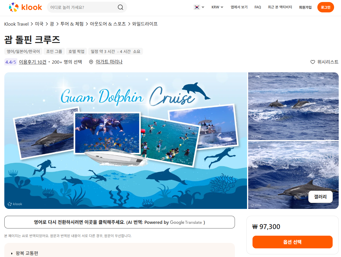 괌여행의 다양한 액티비티 및 경험을 제공하는 돌핀 크루즈 투어는 클룩사이트에서 쉽게 예약하실 수 있으며, 이메일, 전화번호, 카카오톡, 네이버, 구글, 애플, 페이스복 등으로 간편하게 회원가입하고 이용하실 수 있습니다. 요금 및 일정, 포함사항은 변동될 수 있으므로 예약시 다시 확인하고 이용하세요~