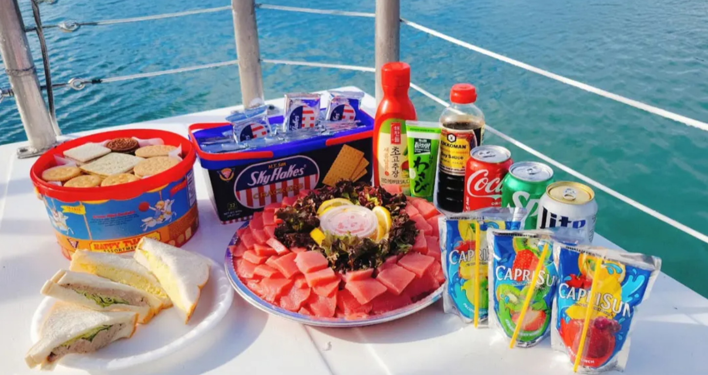 게다가 배 위에서 즐기는 가벼운 낚시도 인기 만점이에요! 낚싯줄을 드리우고 푸른 바다를 바라보며 여유로운 시간을 보내는 것만으로도 충분히 힐링이 되죠. 운이 좋으면 직접 물고기를 낚아 올리는 짜릿한 손맛도 경험할 수 있답니다. 액티비티를 즐기다 보면 슬슬 출출해지기 마련인데요, 대부분의 돌핀 크루즈는 간단한 스낵과 음료, 그리고 갓 잡은 싱싱한 참치회까지 제공해 주기도 해요. 바다 위에서 맛보는 시원한 음료와 신선한 해산물은 그야말로 꿀맛이랍니다.