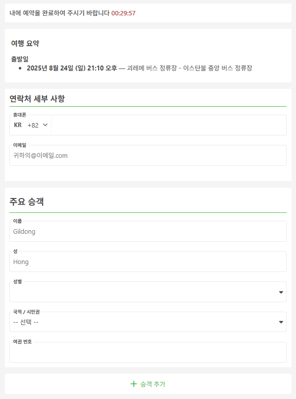 카파도키아 괴레메에서 이스탄불로 이동하는 교통편 버스를 예로들어 예약시에는 휴대폰번호(현지번호 또는 한국번호 모두 가능), 이메일, 이름, 성, 성별, 국적, 여권번호를 입력하고 좌석은 선택사항입니다.