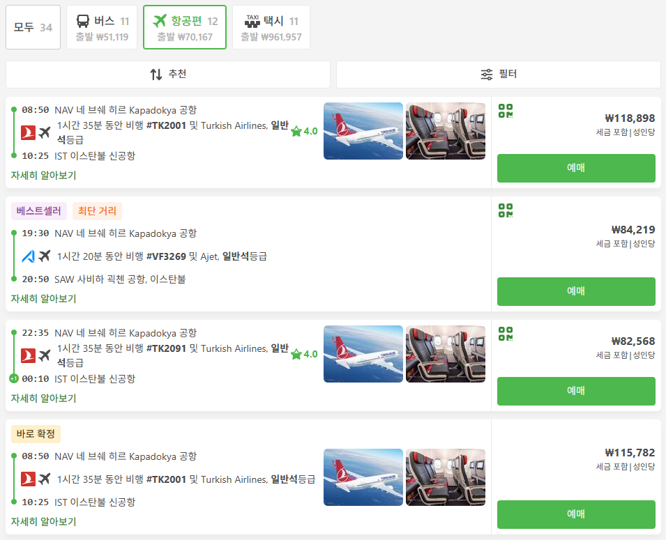 항공편은 카파도키아 지역 내 네브셰히르(Nevşehir) 혹은 카이세리(Kayseri) 공항을 이용하게 되며, 공항까지는 괴레메에서 차량으로 약 40~50분 소요됩니다. 이스탄불공항까지 직항 비행기가 여러 편 운항되어 있으며, 비행 시간은 약 1시간 20분 ~35분정도입니다. 비행기는 시간과 요금 면에서 가장 빠르고 편리한 이동 수단이지만, 공항까지의 이동과 대기 시간, 그리고 택시나 픽업 서비스를 따로 이용해야 하는 점을 고려해야 합니다. 항공권 가격은 시기와 예약 상황에 따라 변동하지만, 버스에 비해 다소 비싼 편입니다. 이스탄불 신공항의 경우 최소 8만원부터 시작하며, 사비하 괵첸 공항으로 도착하는 항공은 최저요금 3만원대도 있습니다.