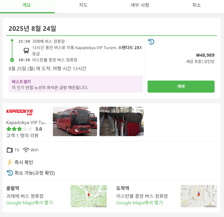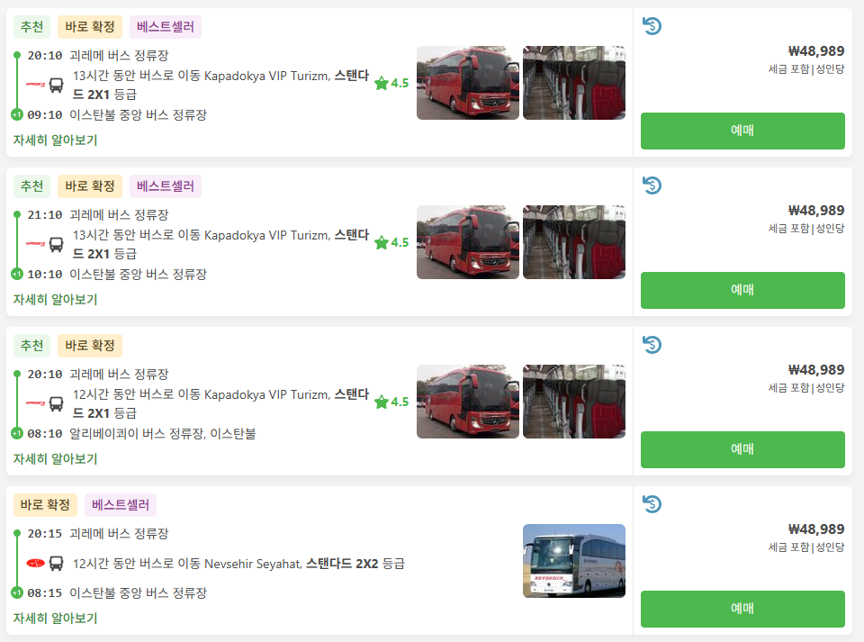 카파도키아 괴레메에서 이스탄불로 이동하는 교통편 노선정보 및 예약은 12go사이트에서 예약하실 수 있으며, 이 노선 뿐만아니라 나라전역의 노선, 나라간 노선의 검색가능한 모든 교통편을 검색하고 예약하실 수 있습니다. 한국어로 검색해보시고 나오지 않으면 영어로 검색하시면 보다 쉽게 노선을 확인하실 수 있습니다. 모든 교통편은 예약을 빨리 하실 수록 저렴한 가격대의 좌석을 선택하실 수 있으며 하루, 이틀 전에 예약하시려고 하면 원하는 시간대가 없거나 만석으로 예약을 못하실 수 있습니다. 교통편은 미리미리 예약하시는 것을 추천합니다.
