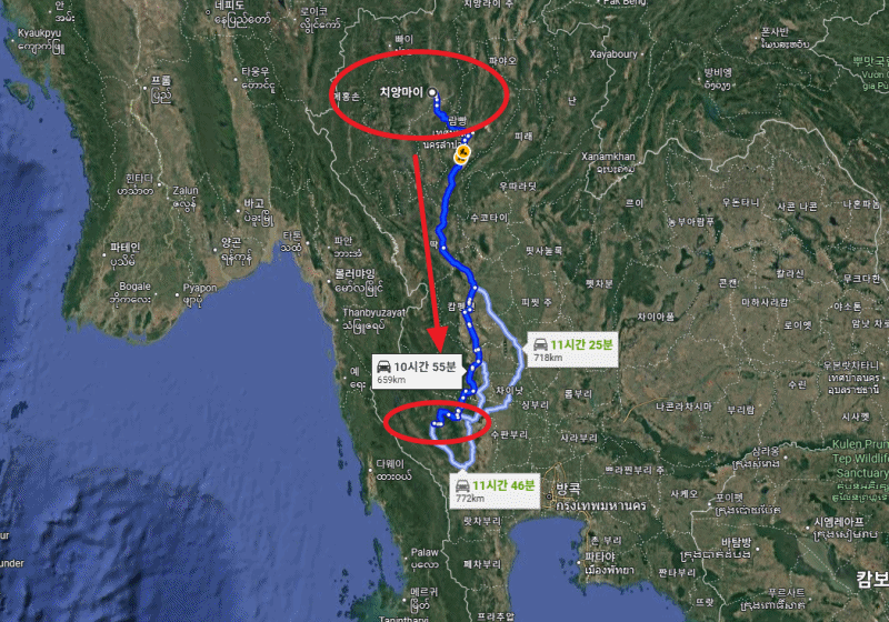 즉, 치앙마이에서 깐차나부리까지는 약 665km 거리이고, 이동 시간은 대략 11시간 정도가 소요된다고 볼 수 있습니다.