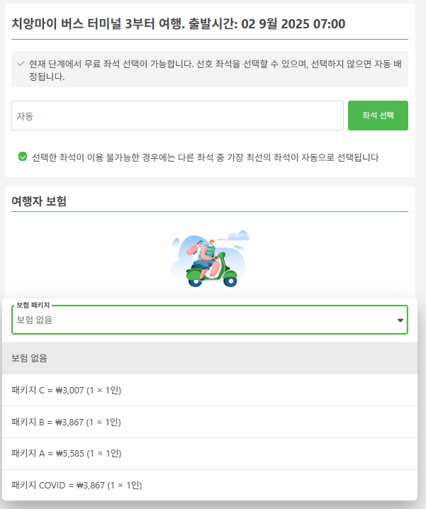 치앙마이에서 깐차나부리로 이동하는 교통편 예약시에는 휴대폰번호(현지번호 또는 한국번호 모두 가능), 이메일, 이름, 성, 여권번호를 입력하고 좌석 및 여행자 보험은 선택사항입니다.