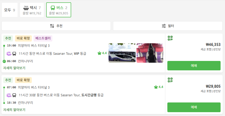 치앙마이에서 깐차나부리로 이동하는 교통편 노선정보 및 예약은 12go사이트에서 예약하실 수 있으며, 이 노선 뿐만아니라 나라전역의 노선, 나라간 노선의 검색가능한 모든 교통편을 검색하고 예약하실 수 있습니다. 한국어로 검색해보시고 나오지 않으면 영어로 검색하시면 보다 쉽게 노선을 확인하실 수 있습니다. 모든 교통편은 예약을 빨리 하실 수록 저렴한 가격대의 좌석을 선택하실 수 있으며 하루, 이틀 전에 예약하시려고 하면 원하는 시간대가 없거나 만석으로 예약을 못하실 수 있습니다. 교통편은 미리미리 예약하시는 것을 추천합니다.