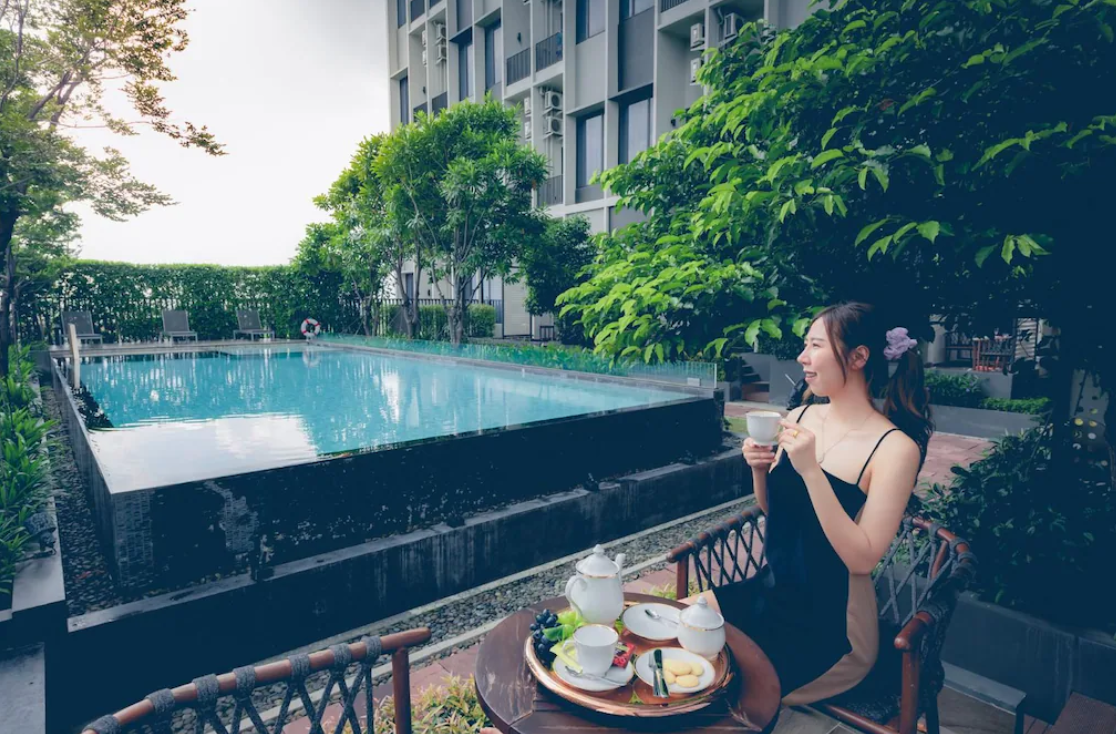 먼저, 호텔에는 야외 수영장이 있어 더운 방콕 날씨에 시원하게 수영하며 휴식을 취할 수 있어요. 운동을 좋아하는 분들을 위해 피트니스 센터도 마련되어 있어 여행 중에도 꾸준히 몸을 관리할 수 있습니다. 넓은 정원과 테라스 공간은 산책하거나 조용히 책을 읽으며 여유를 즐기기에 안성맞춤입니다.