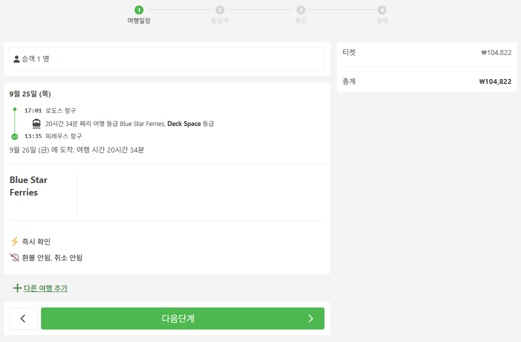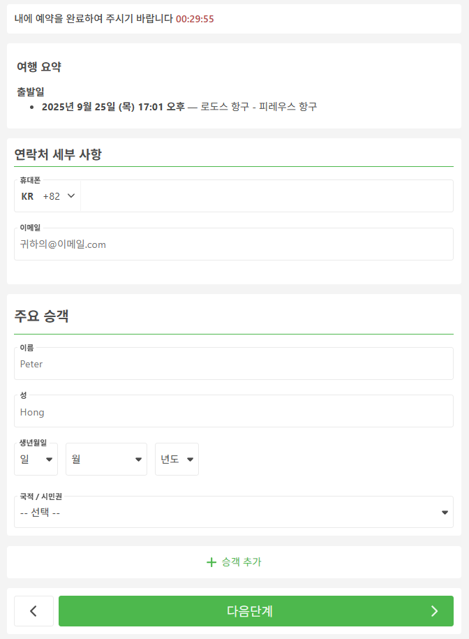 로도스에서 아테네로 이동하는 교통편 페리를 예로들어 예약시에는 휴대폰번호(현지번호 또는 한국번호 모두 가능), 이메일, 이름, 성, 생년월일, 국적을 입력합니다.
