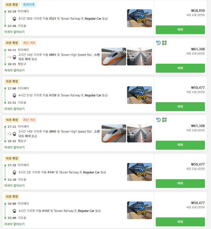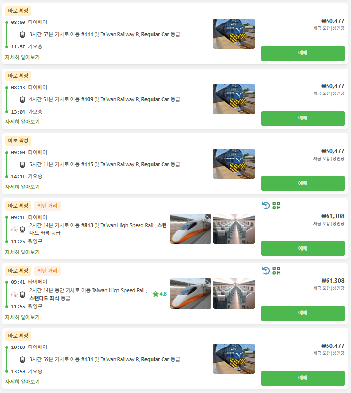 일반 기차는 대만 철도관리국(TRA)이 운영하며, 분위기가 더 여유롭고 경치 감상을 즐길 수 있지만 소요 시간이 4시간 이상으로 더 길다는 점이 단점입니다. 고속철도요금은 6만원대, 일반기차는 3만원대 ~ 5만원대입니다.
