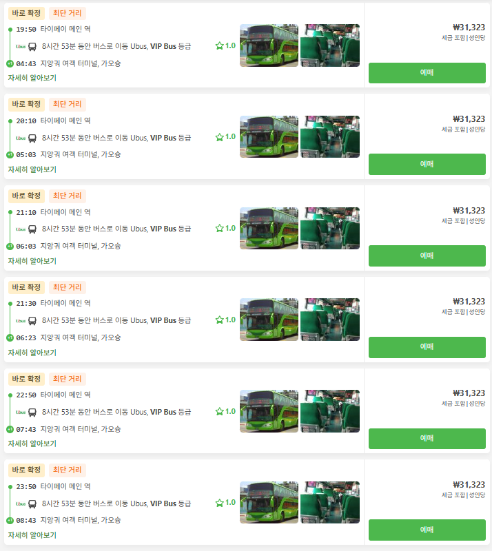 타이베이에서 가오슝으로 이동하는 교통편 노선정보 및 예약은 12go사이트에서 예약하실 수 있으며, 이 노선 뿐만아니라 나라전역의 노선, 나라간 노선의 검색가능한 모든 교통편을 검색하고 예약하실 수 있습니다. 한국어로 검색해보시고 나오지 않으면 영어로 검색하시면 보다 쉽게 노선을 확인하실 수 있습니다. 모든 교통편은 예약을 빨리 하실 수록 저렴한 가격대의 좌석을 선택하실 수 있으며 하루, 이틀 전에 예약하시려고 하면 원하는 시간대가 없거나 만석으로 예약을 못하실 수 있습니다. 교통편은 미리미리 예약하시는 것을 추천합니다.