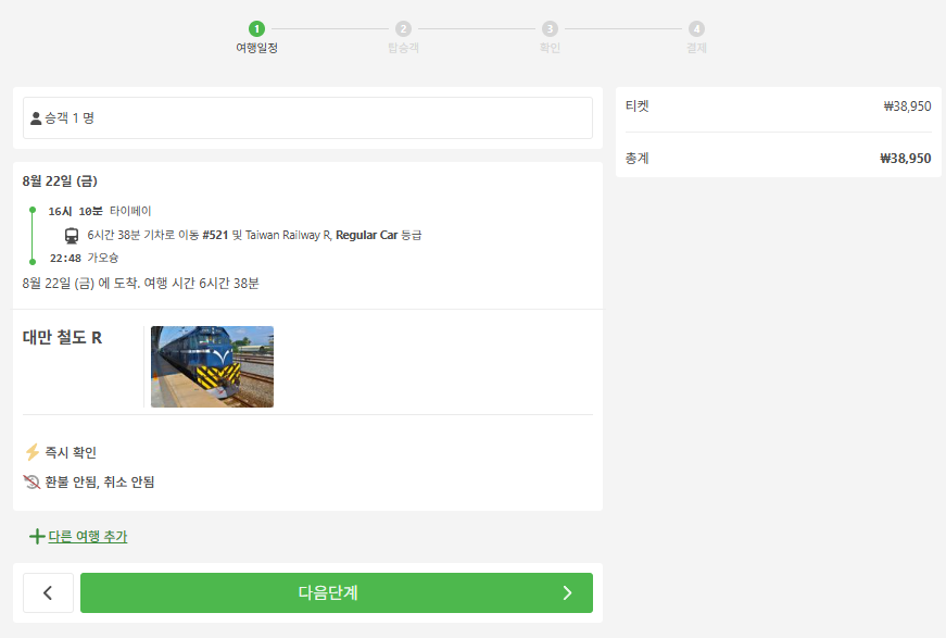 타이베이에서 가오슝으로 이동하는 교통편 중 최저가 일반기차를 예로들면 예약시에는 휴대폰번호(현지번호 또는 한국번호 모두 가능), 이메일, 이름, 성, 국적, 여권번호, 생년월일을 입력하고 여행자 보험은 선택사항입니다.