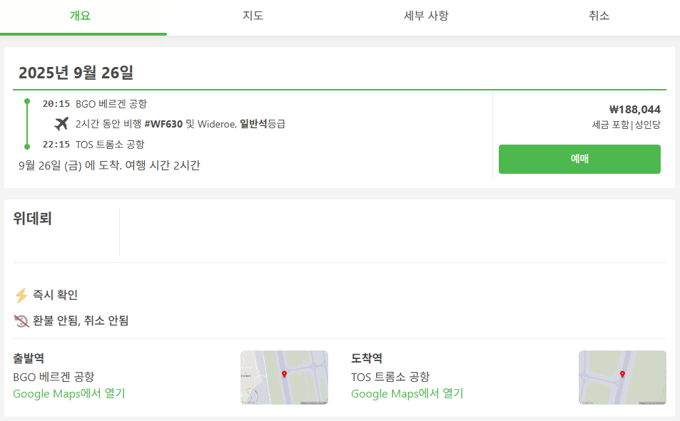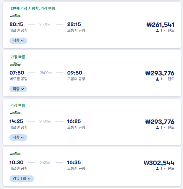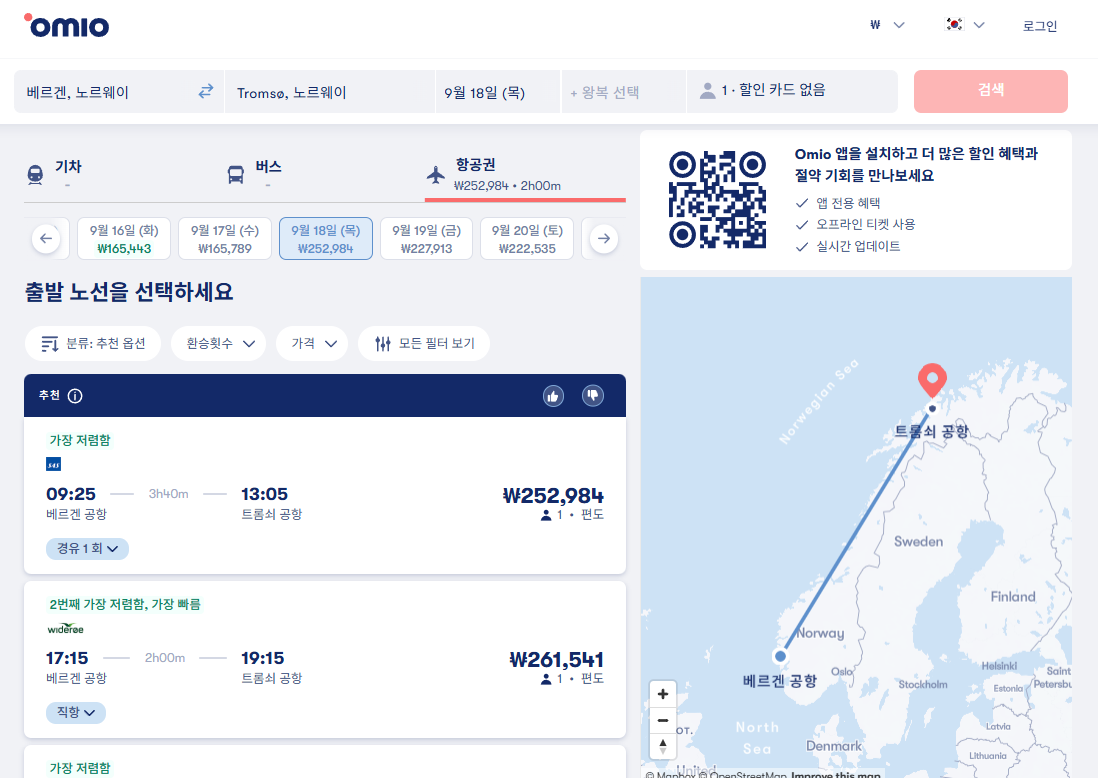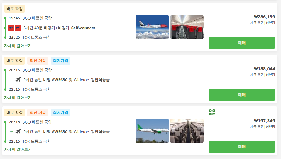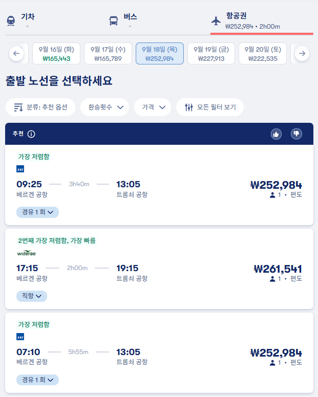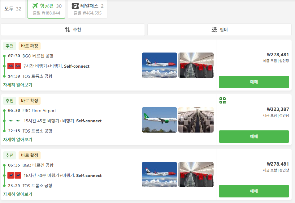 베르겐여행 / 베르겐에서 트롬쇠로 이동하는 항공 교통편 요금 및 이동시간, 온라인 예약사이트