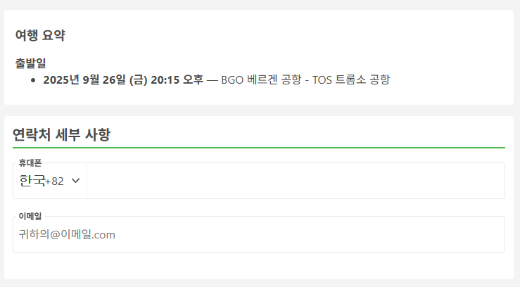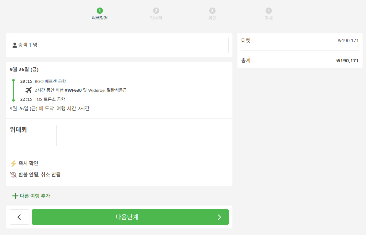베르겐에서 트롬쇠로 이동하는 교통편 항공을 예로들어 예약시에는 휴대폰번호(현지번호 또는 한국번호 모두 가능), 이메일, 이름, 성, 생년월일, 성별, 국적을 입력하고 수하물은 추가할 수 없습니다.(최저가 항공 선택시) 그리고 여행자 보험은 선택사항입니다.