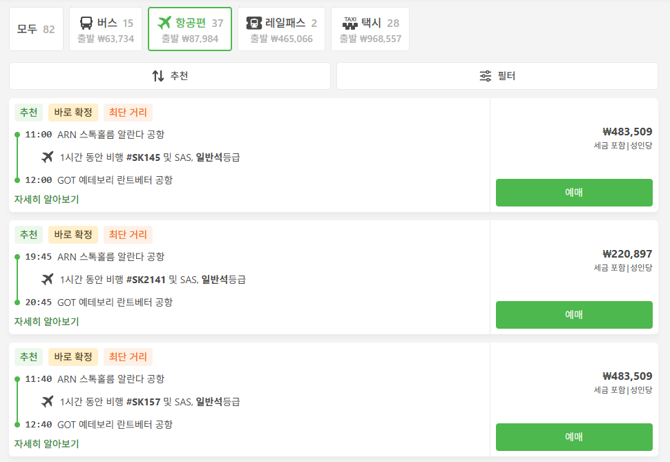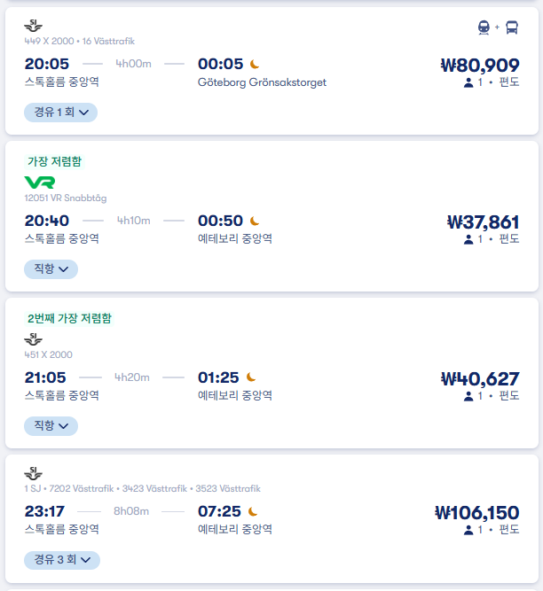 스톡홀름여행 / 스톡홀름에서 예테보리로 이동하는 기차, 버스, 항공 교통편 비교 이동시간 및 요금, 예약사이트