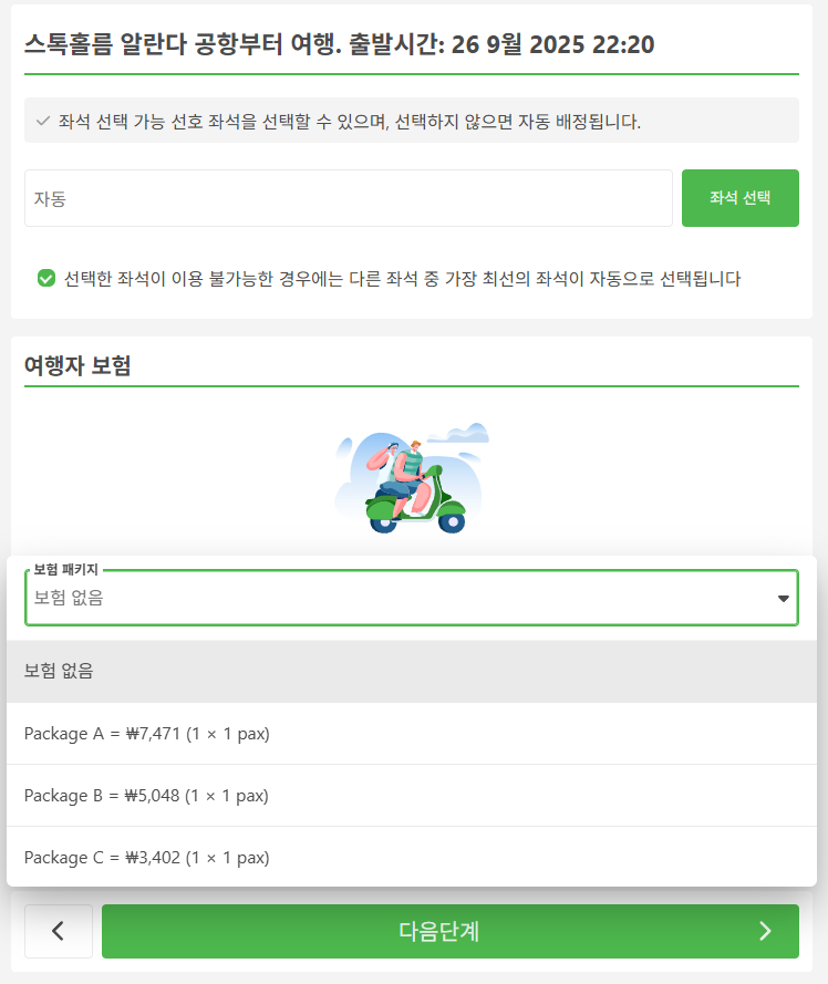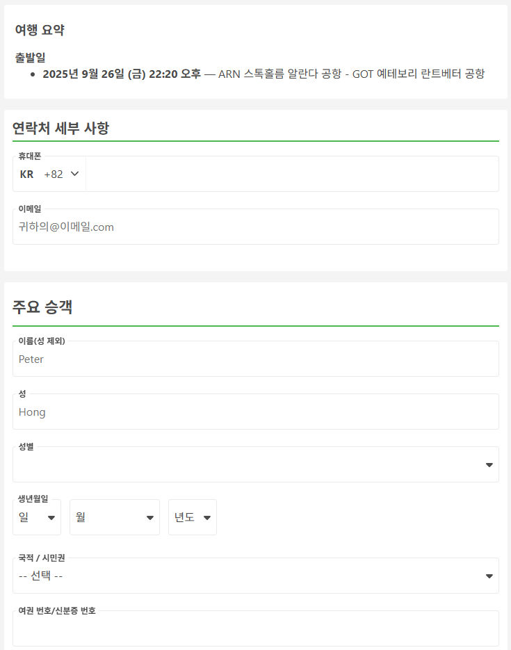 스톡홀름에서 예테보리로 이동하는 교통편 예약시에는 휴대폰번호(현지번호 또는 한국번호 모두 가능), 이메일, 이름, 성, 생년월일, 국적, 여권번호, 여권만료날짜를 입력하고 화물 수하물은 유료로 추가할 수 있습니다. 좌석도 선택할 수 있으며, 여행자 보험도 선택 가능합니다.