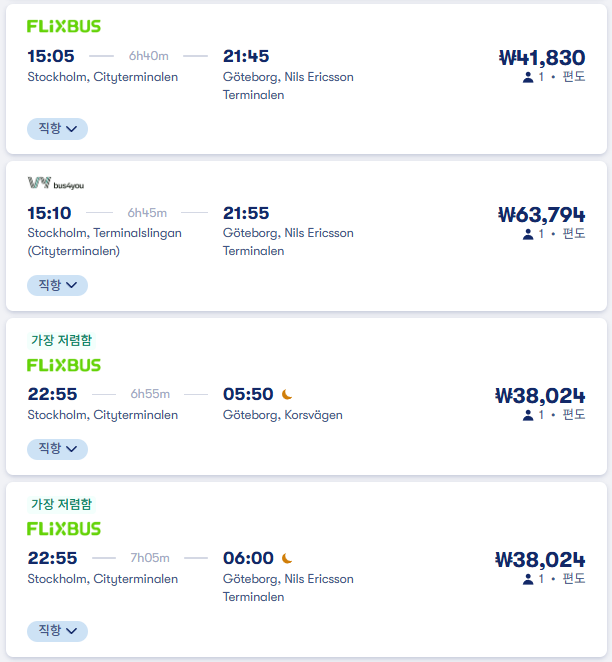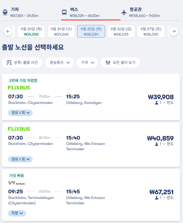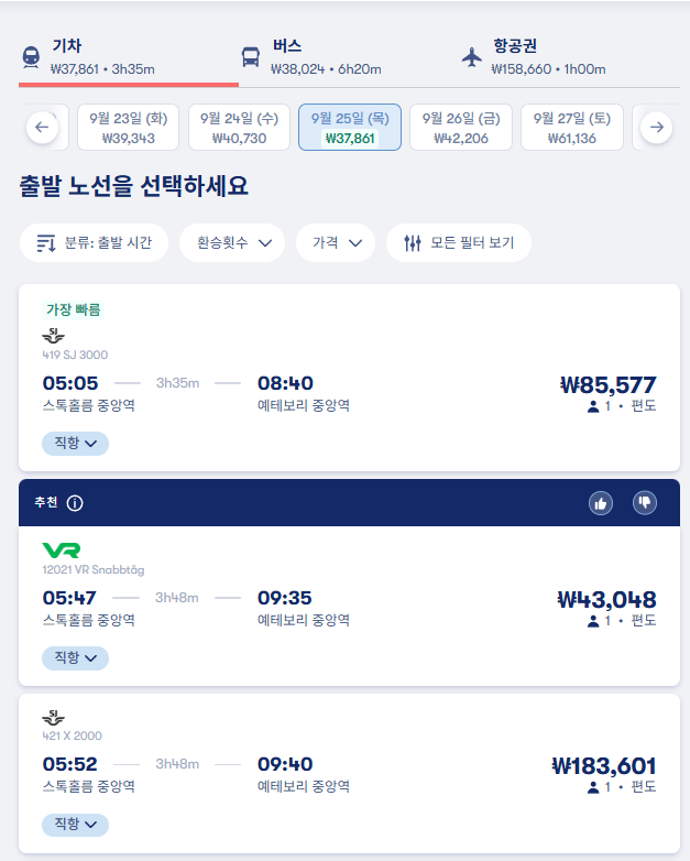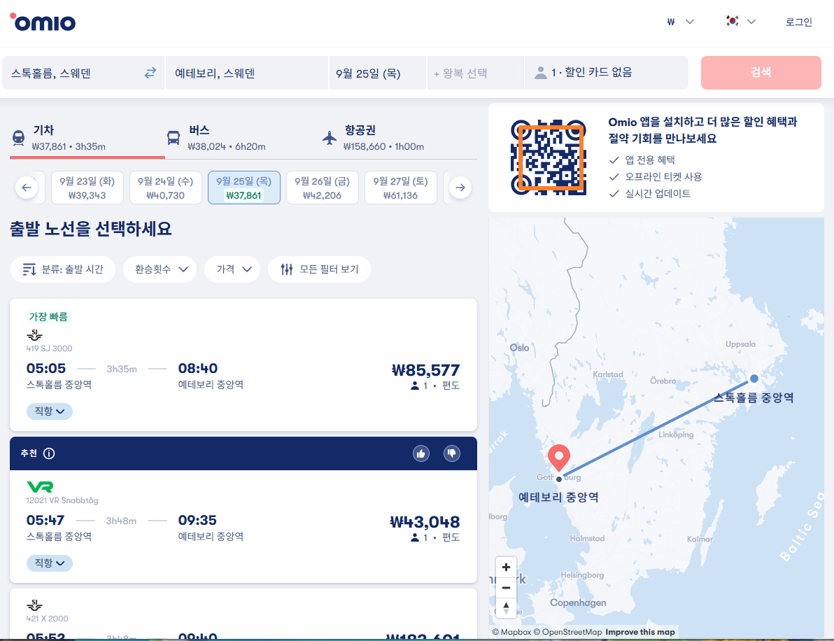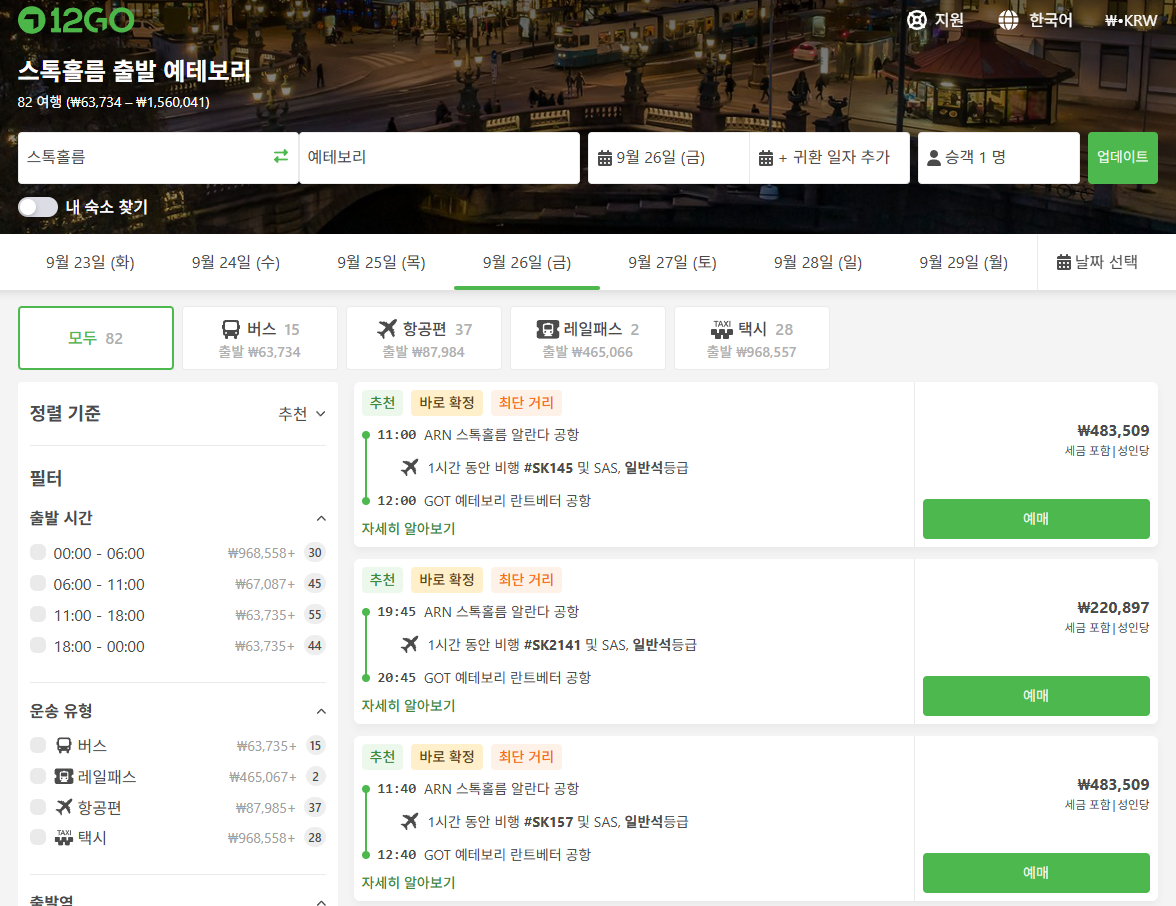 스톡홀름에서 예테보리로 이동하는 교통편은 유명한 12go사이트를 비롯해 omio 사이트를 함께 비교해서 가성비 좋은 교통편을 이용하시는 것이 좋습니다.