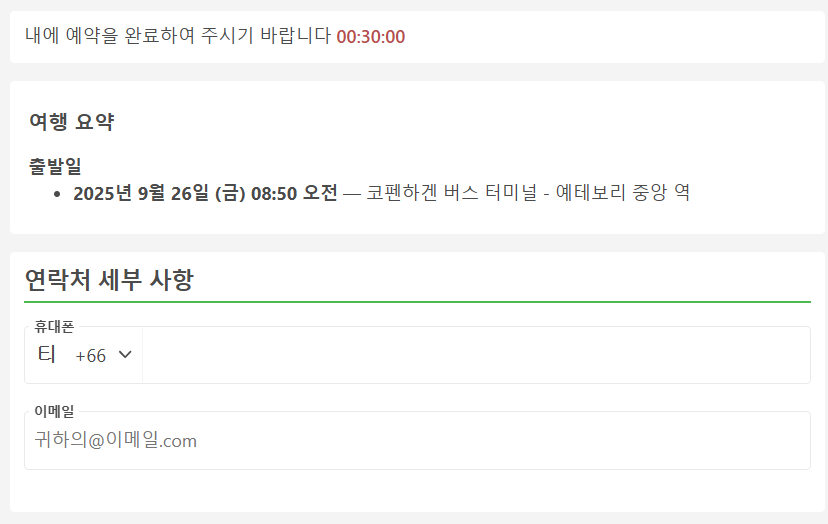 코펜하겐에서 예테보리로 이동하는 교통편 예약시에는 휴대폰번호(현지번호 또는 한국번호 모두 가능), 이메일, 이름, 성을 입력하고 여행자 보험은 선택사항입니다.
