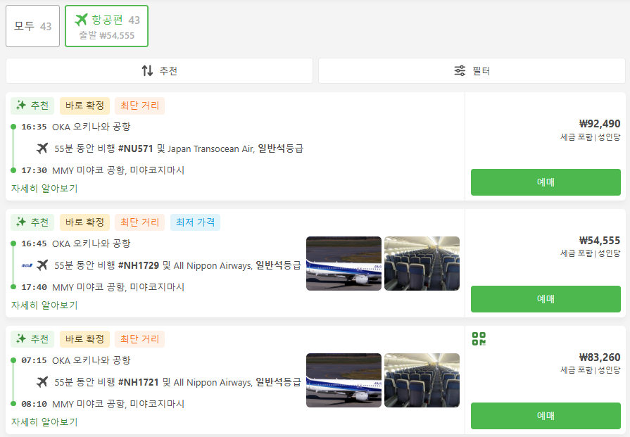 워낙 인기 있는 노선이라서 성수기나 주말에는 일찍 매진될 수도 있으니, 여행 계획이 정해지면 미리 항공권을 예매하시는 게 좋답니다! 오키나와에서 미야코지마로 이동하는 항공 요금은 최저 4 ~5만원대부터 이용할 수 있습니다.