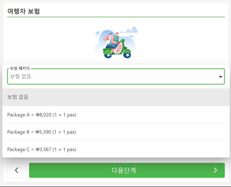 오키나와에서 미야코지마로 이동하는 교통편 예약시에는 휴대폰번호(현지번호 또는 한국번호 모두 가능), 이메일, 이름, 성, 성별, 생년월일, 국적, 여권번호, 여권 만료 날짜를 입력하고 여행자 보험은 선택사항입니다.
