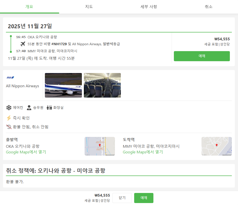 오키나와에서 미야코지마로 이동하는 교통편 노선정보 및 예약은 12go사이트에서 예약하실 수 있으며, 이 노선 뿐만아니라 나라전역의 노선, 나라간 노선의 검색가능한 모든 교통편을 검색하고 예약하실 수 있습니다. 한국어로 검색해보시고 나오지 않으면 영어로 검색하시면 보다 쉽게 노선을 확인하실 수 있습니다. 모든 교통편은 예약을 빨리 하실 수록 저렴한 가격대의 좌석을 선택하실 수 있으며 하루, 이틀 전에 예약하시려고 하면 원하는 시간대가 없거나 만석으로 예약을 못하실 수 있습니다. 교통편은 미리미리 예약하시는 것을 추천합니다.