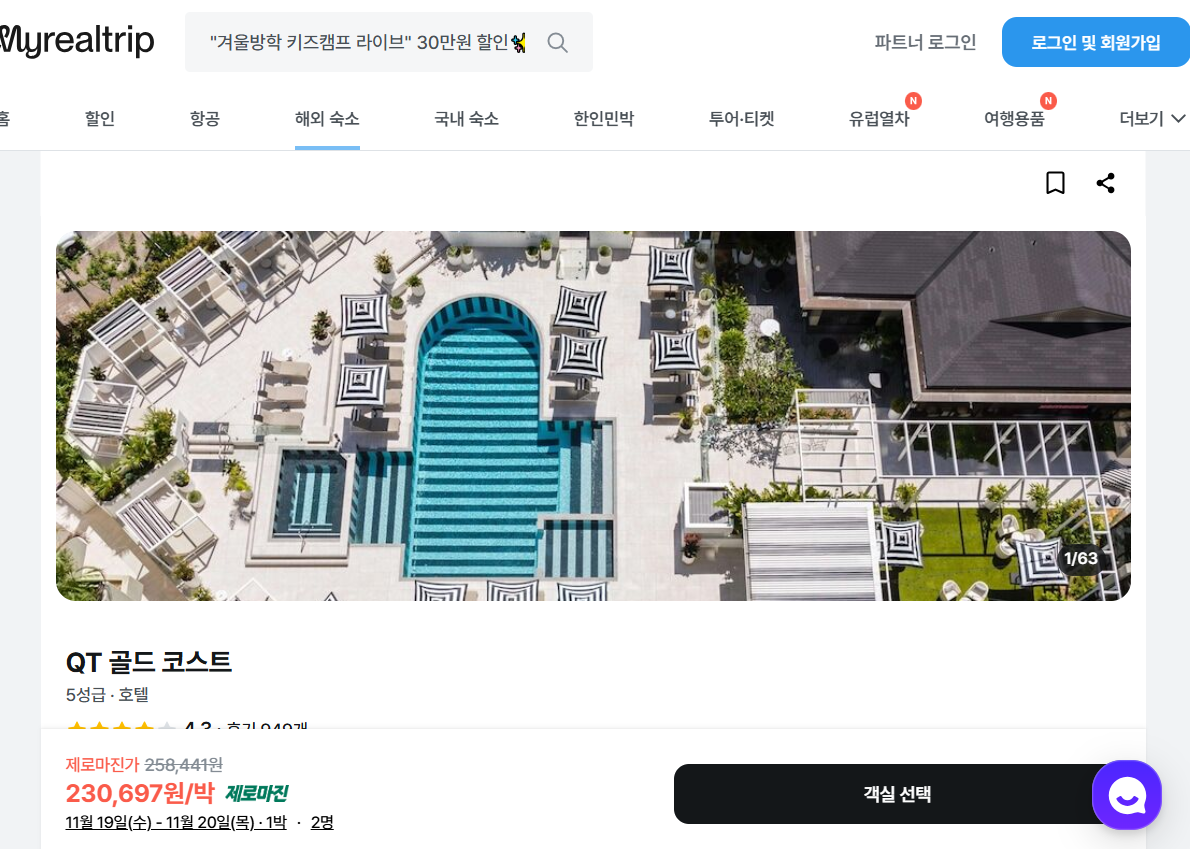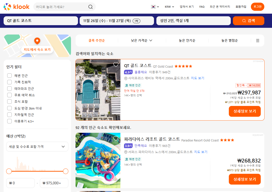 QT 골드코스트 호텔의 1박당 요금 최저 가격대(세금 및 봉사료 포함)는 아고다웹사이트에서 할인특가 가격으로 매일매일 변동되며 10만원대부터 다양하게 형성됩니다. 날짜별로 매일 가격이 다르므로 아고다웹사이트 최저가를 확인하시려면 아래 링크를 누르시고 원하는 날짜의 가격대를 선택해야 정확한 가격을 자세히 보실 수 있습니다.