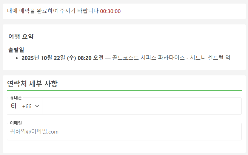골드코스트에서 시드니로 이동하는 교통편 버스를 예로들어 예약시에는 휴대폰번호(현지번호 또는 한국번호 모두 가능), 이메일, 이름, 성, 국적, 성별을 입력하고 여행자 보험은 선택사항입니다.