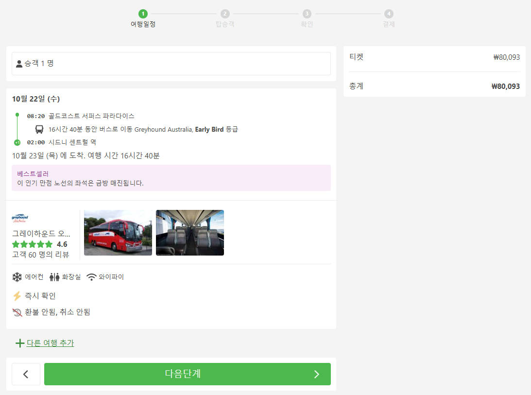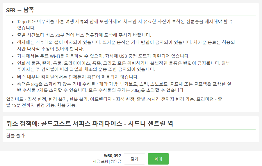 골드코스트에서 시드니로 이동하는 교통편 노선정보 및 예약은 12go사이트에서 예약하실 수 있으며, 이 노선 뿐만아니라 나라전역의 노선, 나라간 노선의 검색가능한 모든 교통편을 검색하고 예약하실 수 있습니다. 한국어로 검색해보시고 나오지 않으면 영어로 검색하시면 보다 쉽게 노선을 확인하실 수 있습니다. 모든 교통편은 예약을 빨리 하실 수록 저렴한 가격대의 좌석을 선택하실 수 있으며 하루, 이틀 전에 예약하시려고 하면 원하는 시간대가 없거나 만석으로 예약을 못하실 수 있습니다. 교통편은 미리미리 예약하시는 것을 추천합니다.