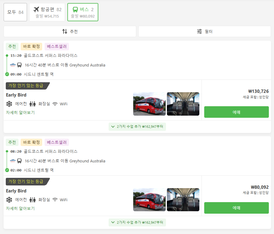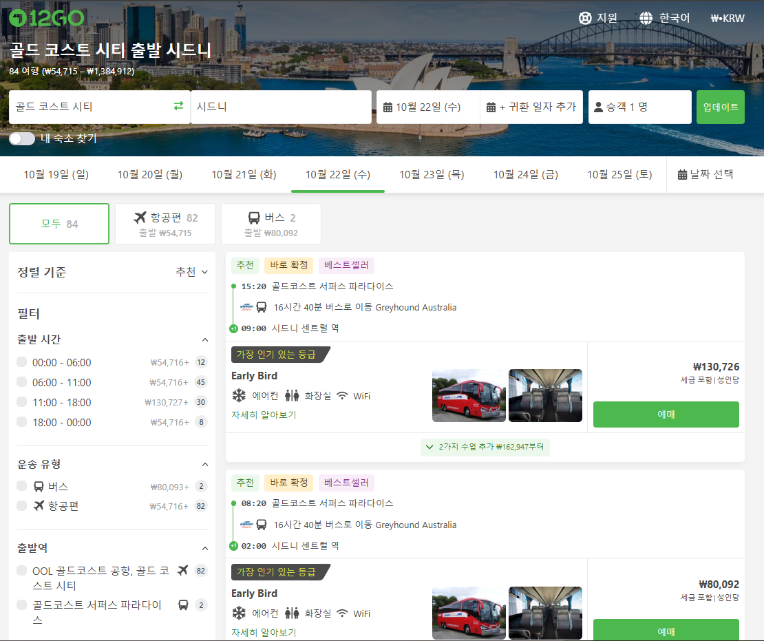 골드코스트에서 시드니로 이동하는 교통편은 유명한 12go사이트를 비롯해 omio 사이트를 함께 비교해서 가성비 좋은 교통편을 이용하시는 것이 좋습니다.