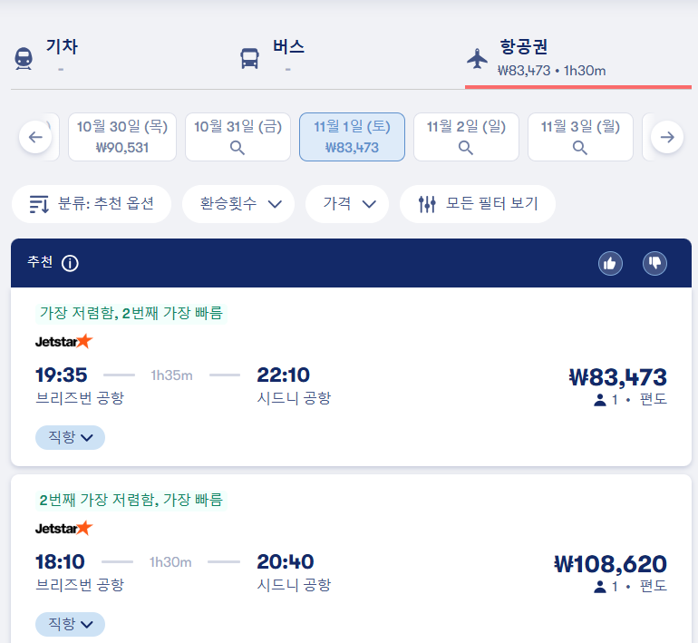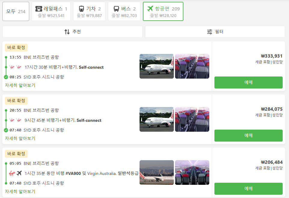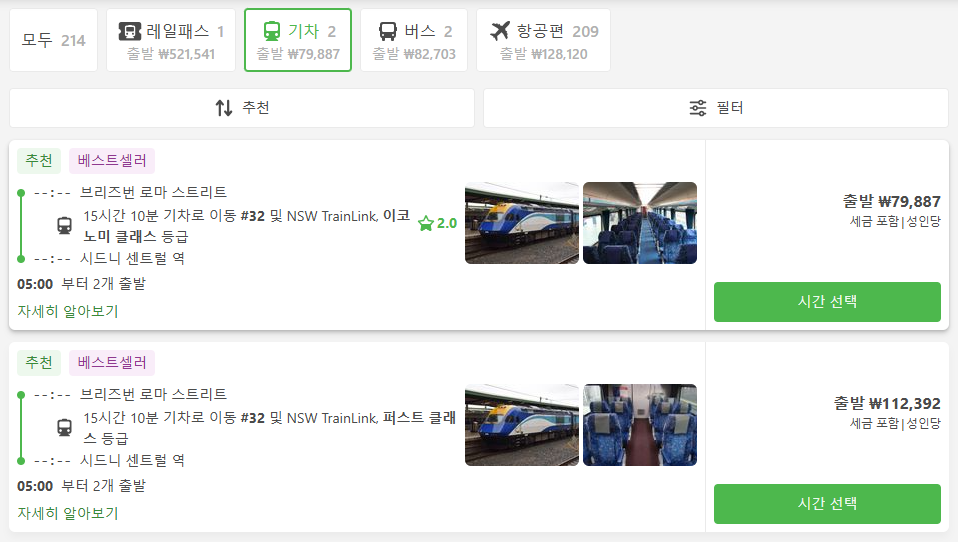 브리즈번에서 시드니로 가는 교통편은 유명한 12go사이트를 비롯해 omio 사이트를 함께 비교해서 가성비 좋은 교통편을 이용하시는 것이 좋습니다.