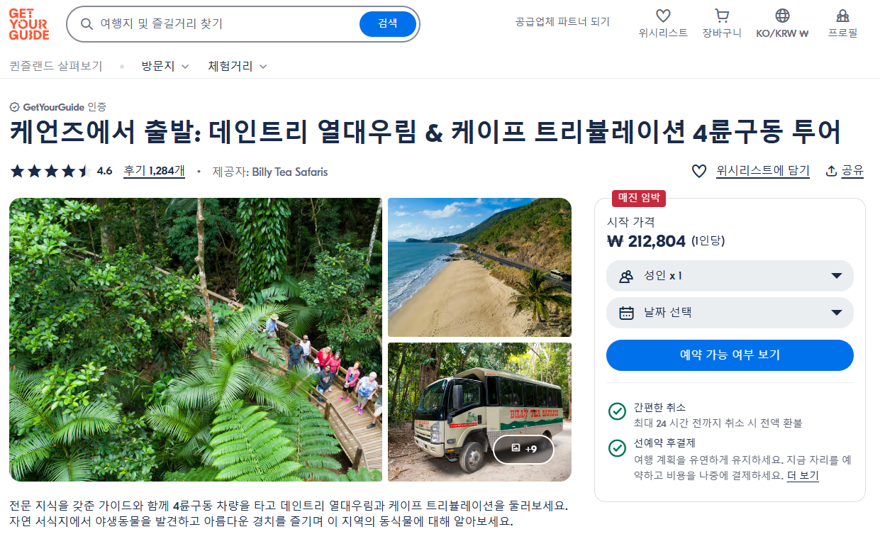 케언즈출발 데인트리포레스트 현지투어는 GET YOUR GUIDE 사이트에서 예약하실 수 있습니다. 사이트는 특히 전세계 대부분의 나라, 지역의 투어, 교통편 있어, 쉽게 찾을 수 없는 여행지의 다양한 투어 및 서비스를 이용할 수 있는 글로벌 사이트입니다. 전세계 여행자들이 많이 사용하는 사이트로 한국분들이 많이 예약하는 투어를 찾으신다면 klook 여행사이트 추천합니다. 함께 사용하시면 더욱 편하게 여행하실 수 있습니다.