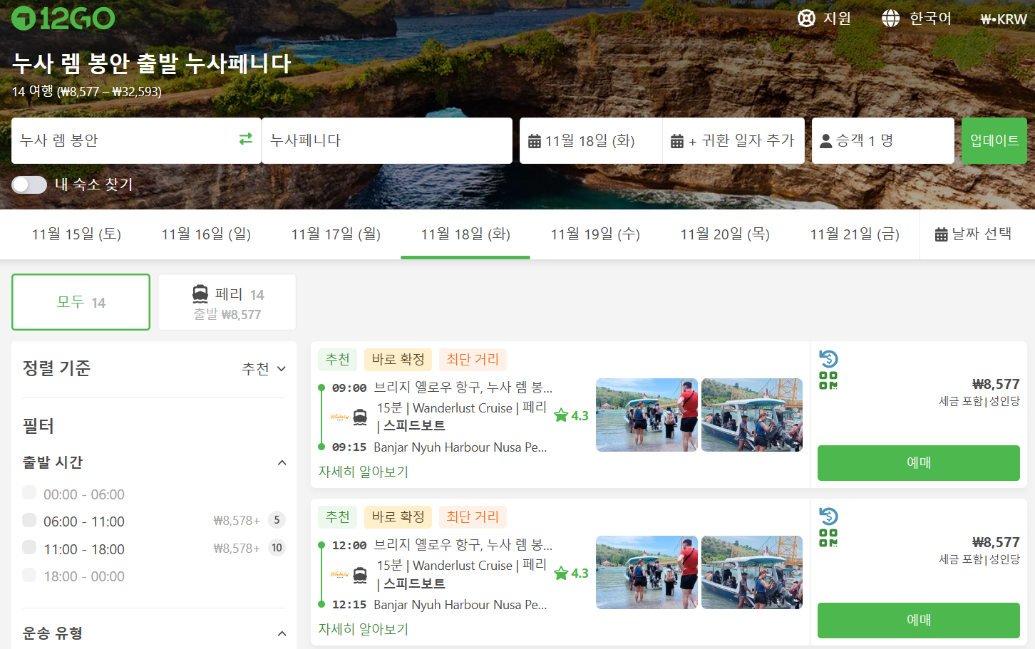누사 렘봉안에서 누사 페니다로 가는 교통편 노선정보 및 예약은 12go사이트에서 예약하실 수 있으며, 이 노선 뿐만아니라 나라전역의 노선, 나라간 노선의 검색가능한 모든 교통편을 검색하고 예약하실 수 있습니다. 한국어로 검색해보시고 나오지 않으면 영어로 검색하시면 보다 쉽게 노선을 확인하실 수 있습니다. 모든 교통편은 예약을 빨리 하실 수록 저렴한 가격대의 좌석을 선택하실 수 있으며 하루, 이틀 전에 예약하시려고 하면 원하는 시간대가 없거나 만석으로 예약을 못하실 수 있습니다. 교통편은 미리미리 예약하시는 것을 추천합니다.