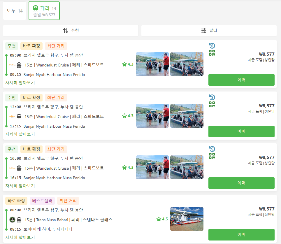 운행 횟수도 하루에 많이 운행되니 원하는 시간에 맞춰 이용하기 편리하실 거예요. "Trans Nusa Bahari"와 "Wanderlust Cruise" 같은 회사들이 운행하고 있고, 요금은 편도 최저 8천원대부터 시작해서 회사나 서비스 종류에 따라 조금씩 달라질 수 있어요.