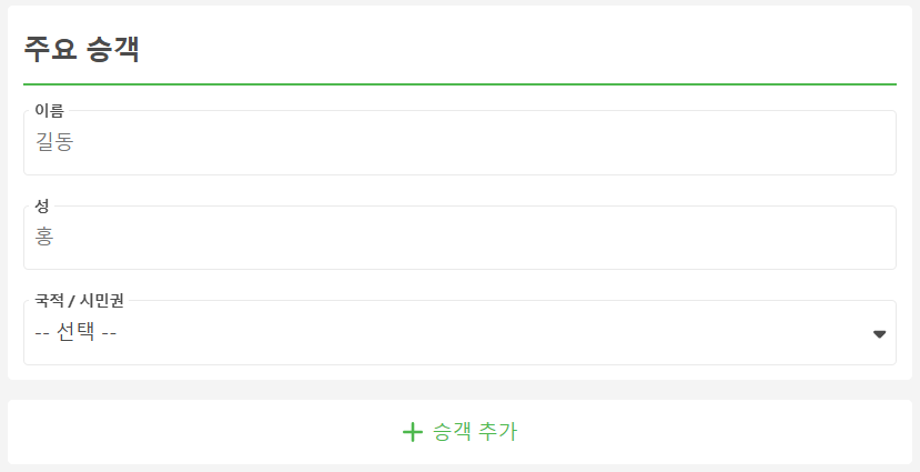+82) 모두 가능), 이메일, 이름, 성, 국적을 입력하고 여행자 보험은 선택사항입니다.
